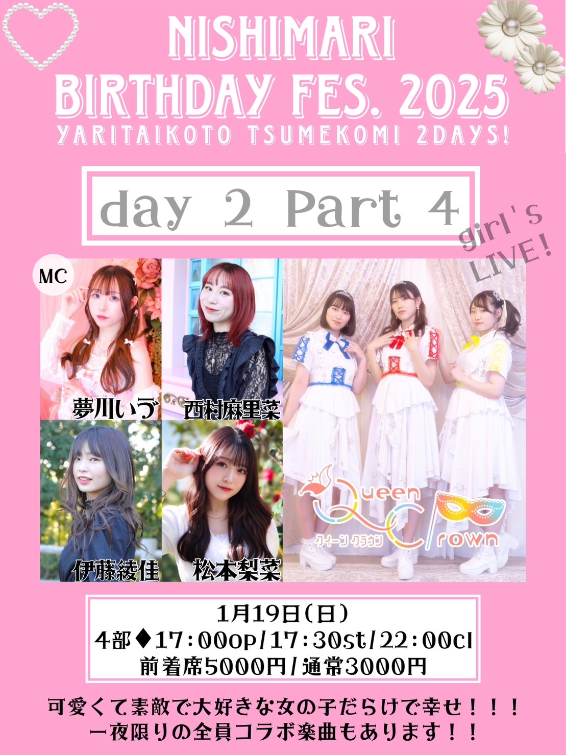 出演者 西村麻里菜 伊東綾佳 松本梨菜 Queen Clrown 夢川いゔ OPEN 17:00 / START 17:30 TICKET ¥3,000 / 前着席 ¥5,000 (1DRINK別)