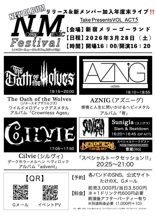 出演者 AZNIG The Oath of the Wolves Cilvie Sunigla OPEN 16:00 / START 16:20 ADV ¥3,000 / DOOR ¥3,500 (1DRINK別) 1ドリンク 600円 ロック / メタル