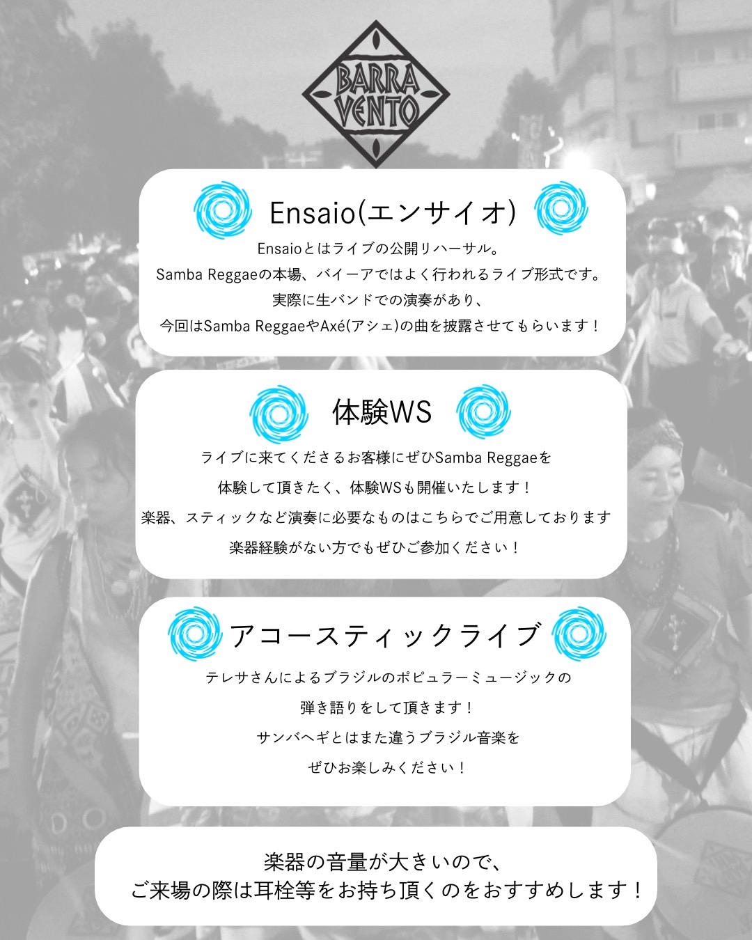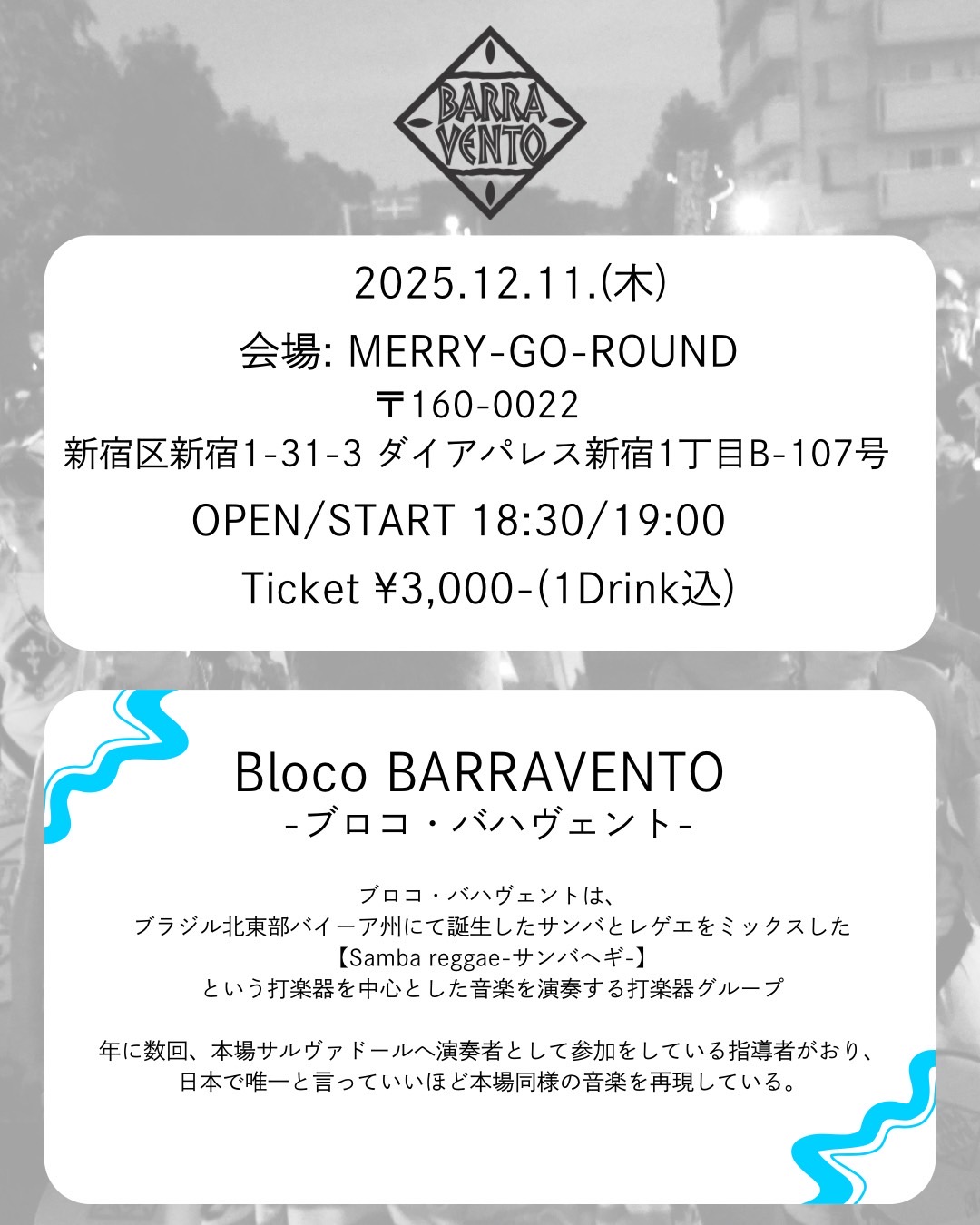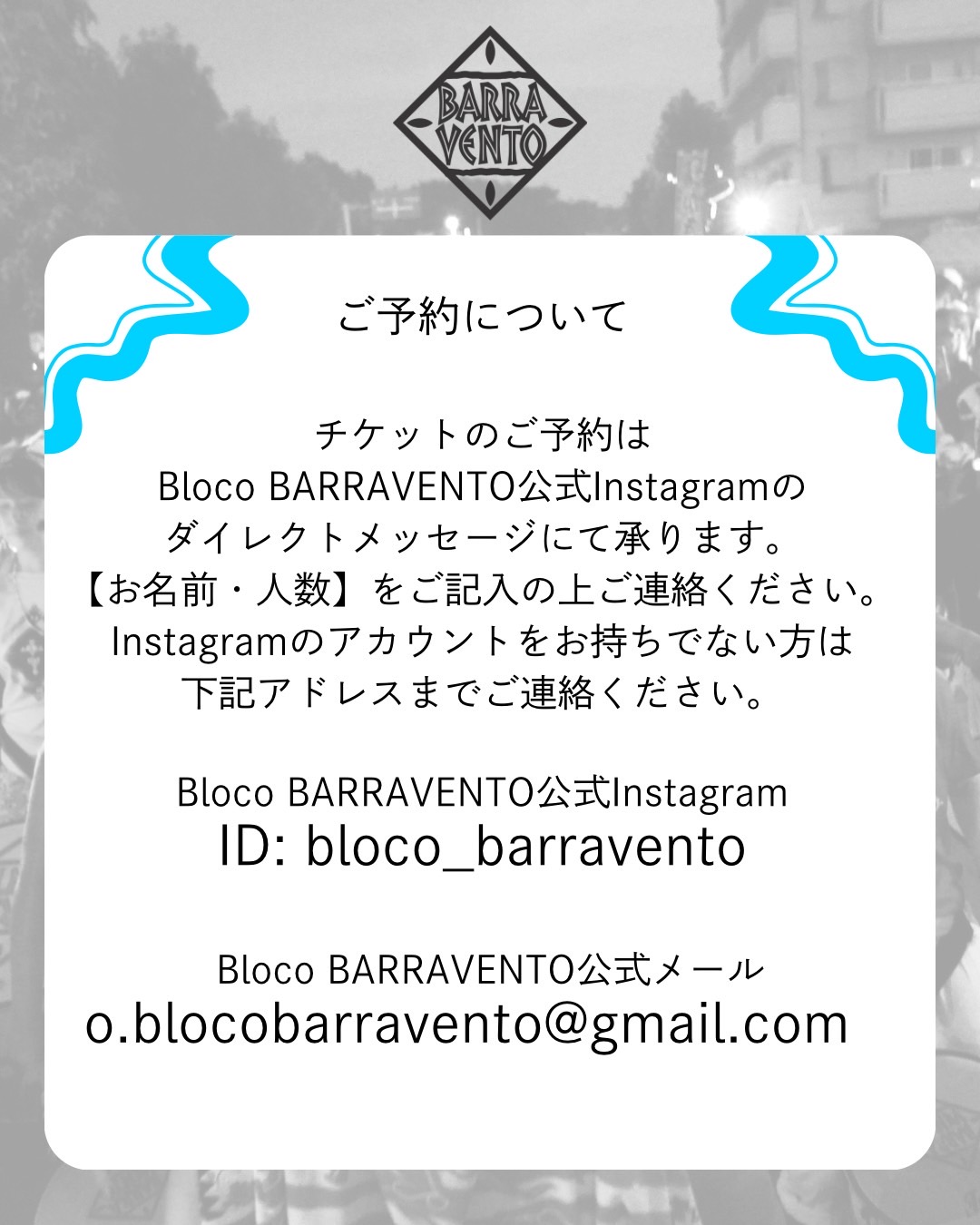 チケットご予約はBloco BARRAVENTO公式Instagramのダイレクトメッセージにて承ります。