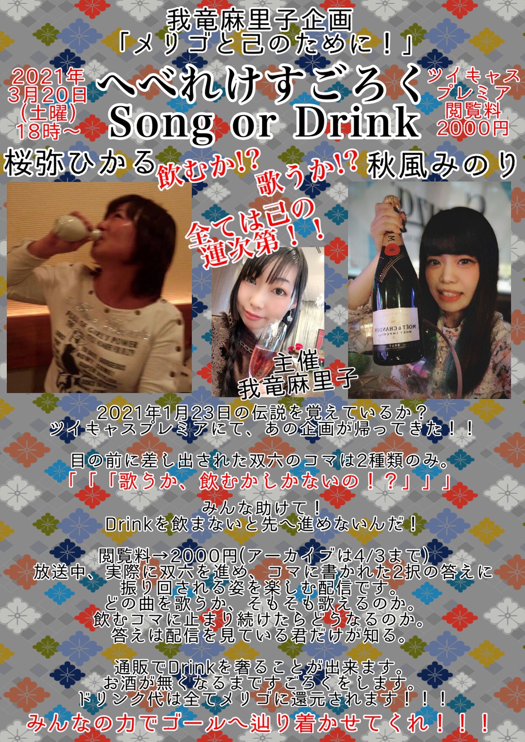 出演者 我竜麻里子 桜弥ひかる 秋風みのり OPEN 18:00 / START 18:00 視聴チケット¥2,000